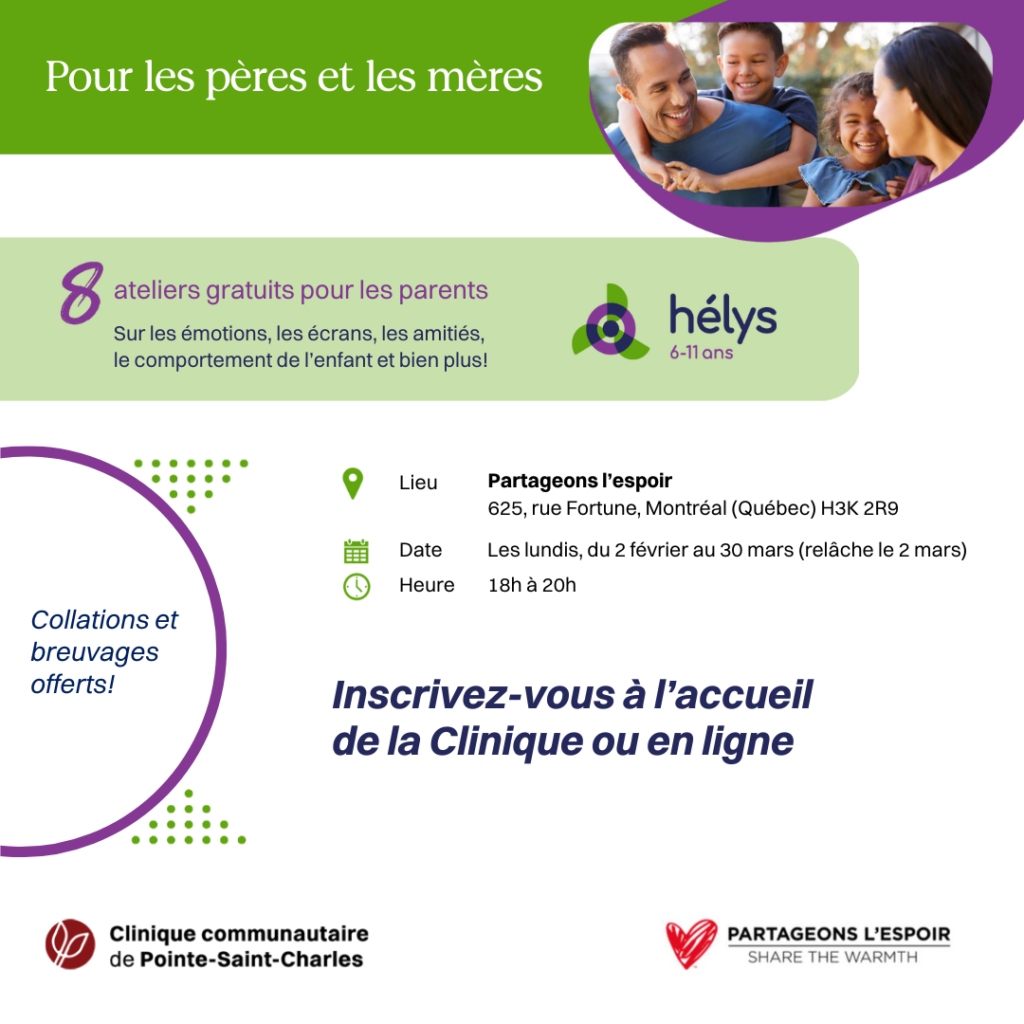 Les ateliers se dérouleront les lundis, du 2 février au 30 mars (avec une pause le 2 mars pour la relâche scolaire), de 18h à 20h dans les locaux de Partageons l’espoir (625, rue Fortune).