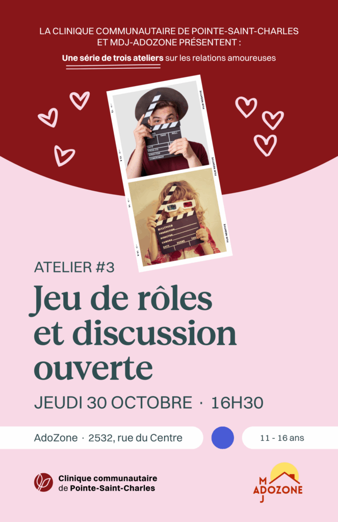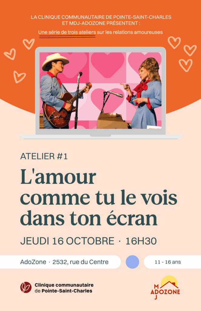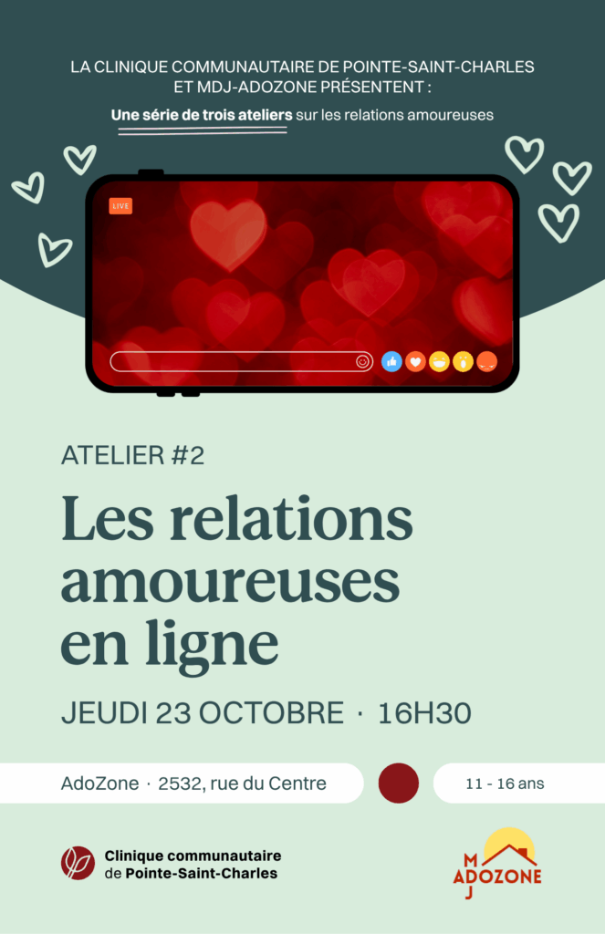 La Clinique communautaire de Pointe-Saint-Charles et la maison des jeunes de Pointe-Saint-Charles invitent les jeunes à participer à une série de trois ateliers sur les relations amoureuses donnés par un travailleur social et une travailleuse sociale de la Clinique.